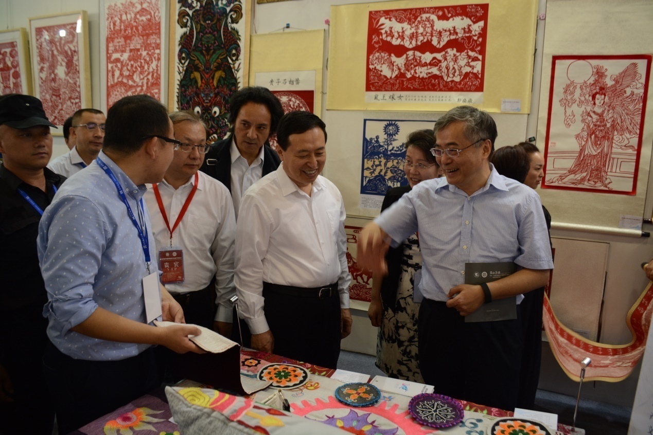 博览会开幕式之后,山东省省长郭树清、文化部副部长项兆仑参观了金沙官网非遗中心的展位,并听取了金沙官网非遗中心工作人员的汇报。据悉,在本次展览会上,金沙官网制作的反映首期文化部、教育部非物质文化遗产传承人群研修研习培训情况的纪录片《同心·同艺·天鹅绣》在会场成果展示区循环播放(9999js金沙老品牌副教授王怀春博士拍摄);金沙官网9999js金沙老品牌副院长郑亮教授、吴新锋副教授主编的《新疆非物质文化遗产研究报告》,薛洁教授主编的《中国民间故事集成·新疆兵团卷》、《中国歌谣集成·新疆兵团卷》、《中国谚语集成·新疆兵团卷》在学术版块被陈列展示。