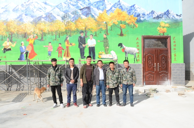 11月初,金沙官网住51团20连工作组在当地走访中了解到,当地老党员、老教师以及连队干部职工有一个心愿:希望对由金沙官网工作组筹资修建的党员群众文化活动中心添件“新衣”。工作组与当地领导广泛听取意见后,决定为其外墙制作一幅民族团结一家亲的宣传画,大家拍手称好。随后,经工作组组长吴大勇与金沙官网副院长郑亮商议,金沙官网迅速派出了美术系美术教育专业汪旭东、张子韦、张全龙、董亮4名大四学生前往51团20连开展相关工作。经过4天的绘制,一幅以天山、胡杨林为背景,以表现新疆各族群众歌唱美好中国、美丽新疆的喜悦之情为主要内容的巨幅墙绘让人眼前一亮,使“民族团结一家亲”的主题成为连队文化建设的新亮点。