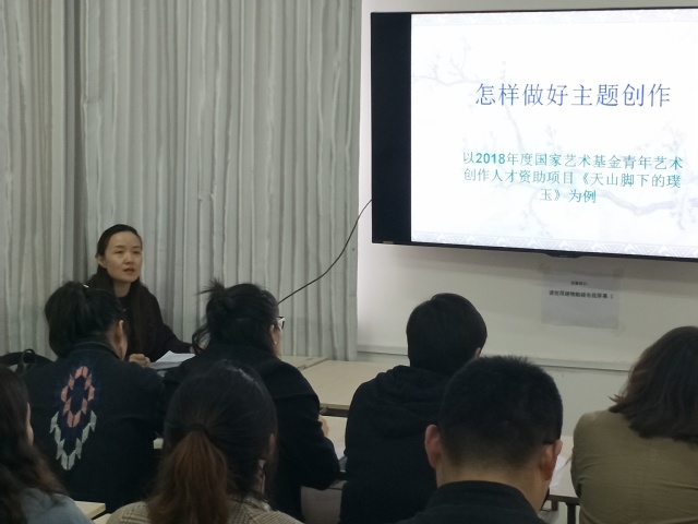 绘画教研室党员陈敏老师结合自己在2018年度获立项的国家艺术基金青年艺术家资助项目《天山脚下的璞玉》,从选题的产生,前期基础,主题思想,创作构思,艺术特色,与画面有关的几个问题等六个方面跟大家分享了《怎样做好主题创作》的相关问题。