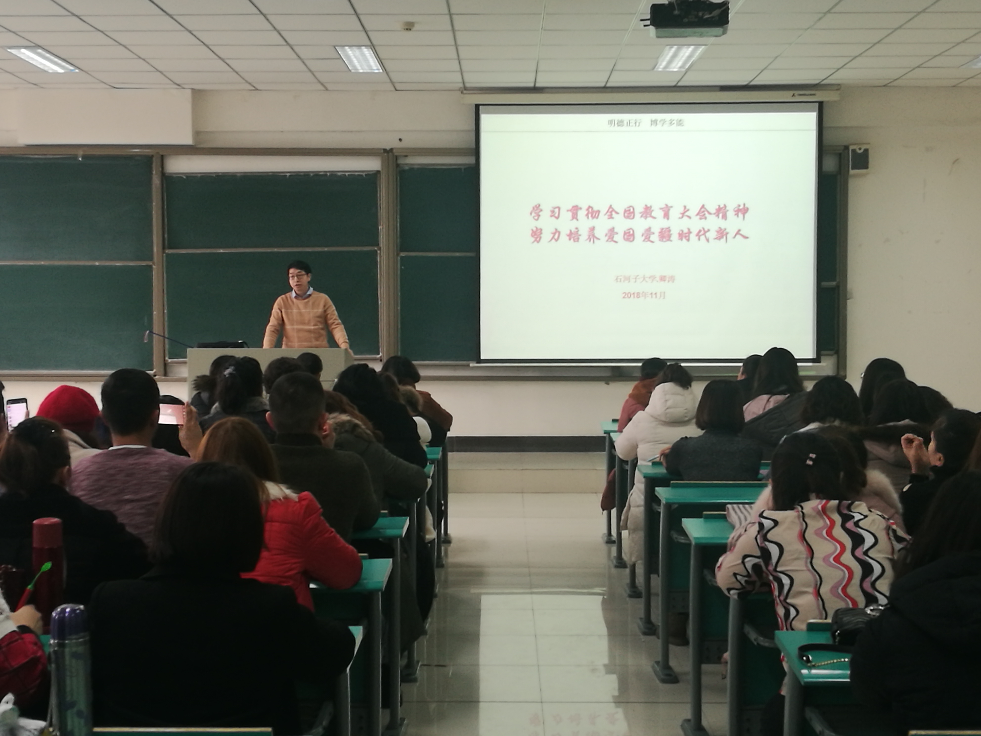 2018年11月24日下午,9999js金沙老品牌特邀请大学宣传部卿涛老师为2018年自治区少数民族教师“岗位能力提高”培训学员进行了“学习贯彻全国教育大会精神 努力培养爱国爱疆时代新人”的讲座,全体在校培训学员82人参加了此次讲座。