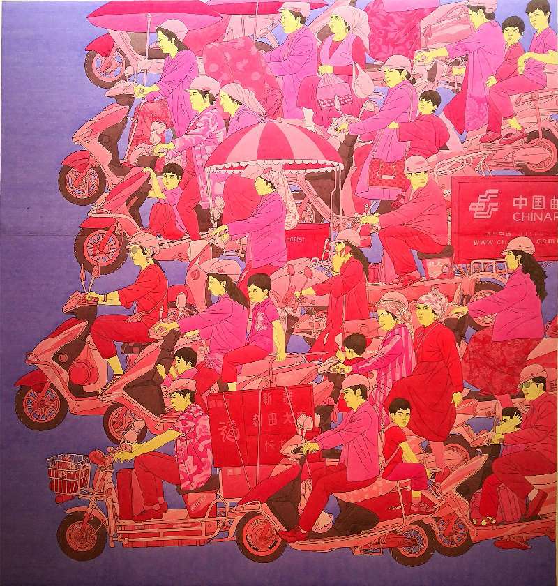李子老师作品《吉日·巴扎》,此画取材新疆南疆赶巴扎的场景,从以前的交通工具毛驴车到现代的电动车,反应少数民族生活的变化。体现祖国富强,新疆少数民族地区生活的现代化生活。通过强烈的色彩对比表现少数民族热情奔放的性格。用有温度的色彩,有动感的形式,表现人民奔向现代幸福生活!