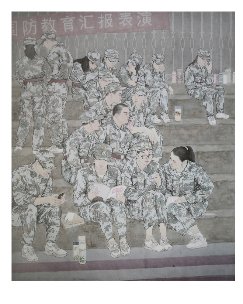 其中陈敏老师的作品《天山脚下的璞玉》主要表现不同民族大学生在接受国防教育活动的片段,画面呈现的不仅是青春的唯美更是人生与艺术的哲理。在塑造人物形象时,注重挖掘人物内在的气质、神情和心理活动。同时,在对待多人物的场景,细致的处理人物之间的互动与联系,并营造整体统一的画面氛围。用“璞玉”象征不同民族的学生真挚、淳朴的世界,以及风华正茂的青春,体现出当代兵团新一代的精神面貌。