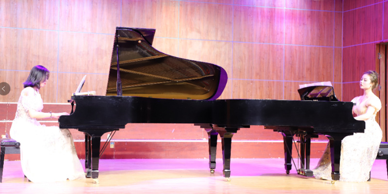 音乐会演奏的第一首曲目是由2020级硕士研究生李美凝和2020级彭琳合作的德沃夏克的《斯拉夫舞曲》, 《斯拉夫舞曲》虽取名舞曲,但并不是根据舞蹈而编写的曲目,它是作曲家根据的民间舞蹈改编的管弦乐作品,属于音乐会音乐,现又被改编成了双钢琴作品。斯拉夫舞曲以绚丽的色彩和热烈的青春气息受到人们的欢迎。