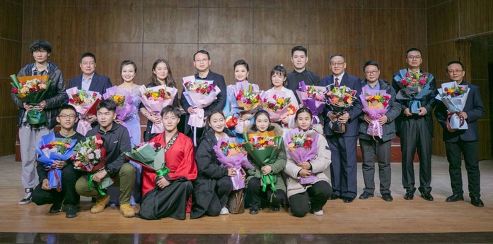 音乐与舞蹈系节目以人民之歌、时代之曲、青春之舞,引领大家回顾了学院“筚路蓝缕,以启山林”的成长历程,展示了全院教职工同舟共济成就学院辉煌发展之态势:开场舞《少年志》舞起《少年中国说》的战歌,二胡独奏《良宵》(原名《除夜小唱》)、双人舞《喜》、钢琴奏鸣曲《热情》、男高音《滚滚长江东逝水》抒发了欢叙守岁、共度良宵的愉悦以及对美好未来的向往与豪情,男中音《小白杨》、钢琴四手联弹《萨利哈最听毛主席的话》《唱支山歌给党听》、民族声乐演唱《故乡是北京》、琵琶独奏《红梅赞》、独舞《万疆》表现出了对伟大祖国、伟大中国共产党的无限热爱。杜瑶教授一曲《乡愁》,唱出了坚守边疆20余年的坚定之志、唱出了对家乡浓浓的思念之情,李赋教授当即赠诗一首:思念家乡无数夜,扎根新疆若干年,桃李天下人未老,岁月不改玉容颜。