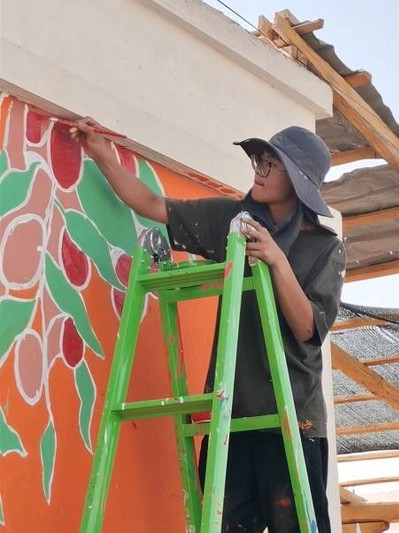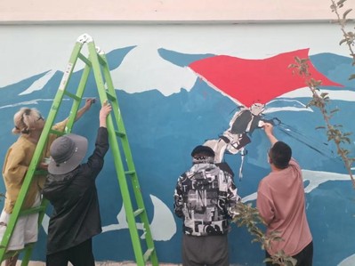 (同学们在烈日下进行墙绘工作)