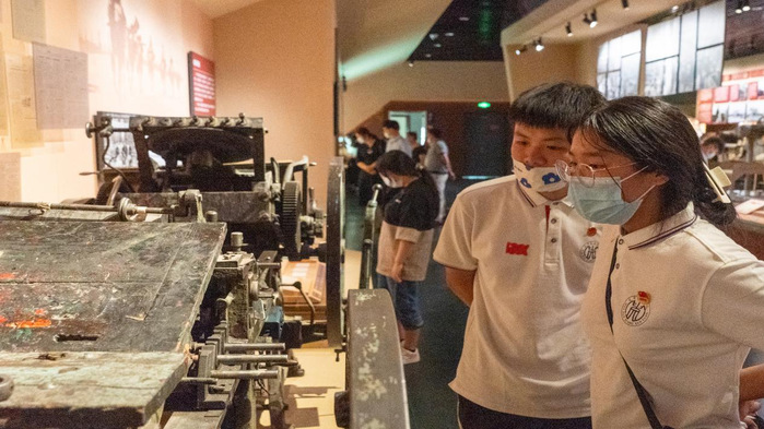 图为实践团成员观看油墨印刷机器的场景赵正航/摄