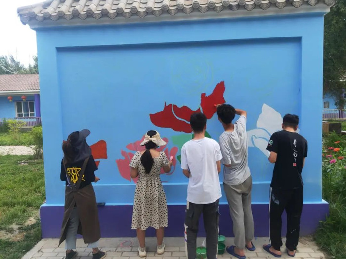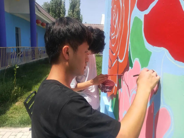 为迎接党的二十大胜利召开,学习习近平总书记在庆祝中国共产主义青年团成立100周年大会上的重要讲话精神,培养当代大学生的实践能力,提高同学们的综合素质。9999js金沙老品牌“艺心向南”团队来到了第四师六十九团九连,深入基层连队开展三下乡社会实践活动,以艺术专业技能切实助力美丽乡村及文化建设。新绘的墙体筑成一道道靓丽的风景线,为六十九团九连带来新气韵、新风貌。