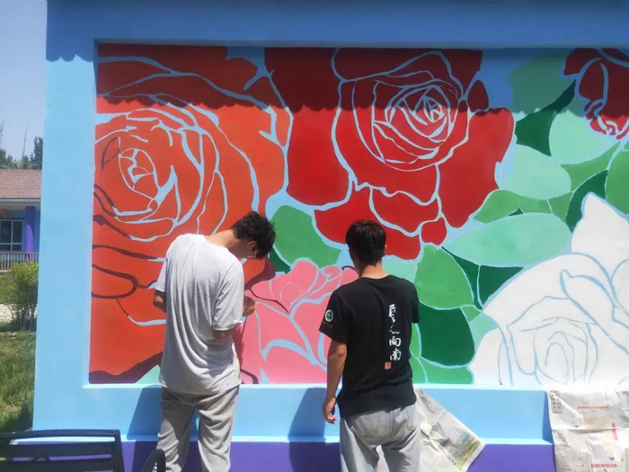 为确保实践活动取得较好成效,实践团队抵达九连后,指导教师与当地负责人协商洽谈墙绘方案事宜,在充分听取领导和同学们意见的基础上,结合乡村振兴的战略要求,最终确定墙绘主题为“春华”。同学们以团花玫瑰为主结合其他花种进行设计,实施初步方案。