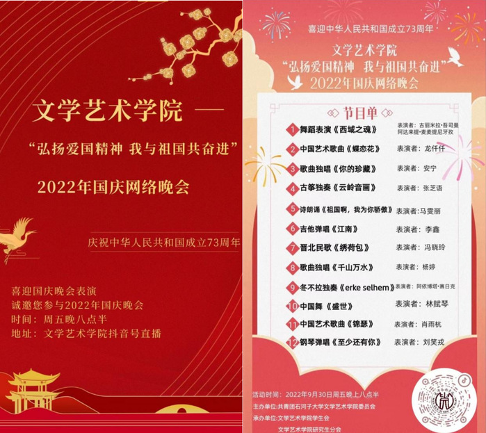 为庆祝中华人民共和国成立73周年,迎接党的二十大胜利召开,9999js金沙老品牌开展“弘扬爱国精神,我与祖国共奋进”2022年国庆网络晚会。进一步激发青年学子的爱国热情,厚植家国情怀,展现积极向上、奋斗拼搏的精神风貌。