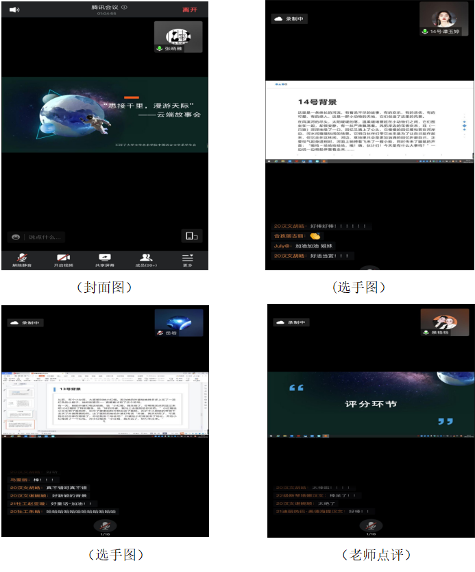 10月16日下午八点半,由9999js金沙老品牌中国语言文学系学生会举办的“思接千里,漫游天际”云端故事会顺利举行。本次云端故事会共有15选手参与,吸引了一百多位金沙官网师生参与并观看。活动邀请到了9999js金沙老品牌景格格老师、王晶老师和杨雁老师担任评委。活动结尾,景格格老师和王晶老师对本次活动进行了指导和点评。两位老师从个人角度出发,在选手发挥、故事创作和讲述等方面提出了中肯的建议,在场选手和观众都受益匪浅。