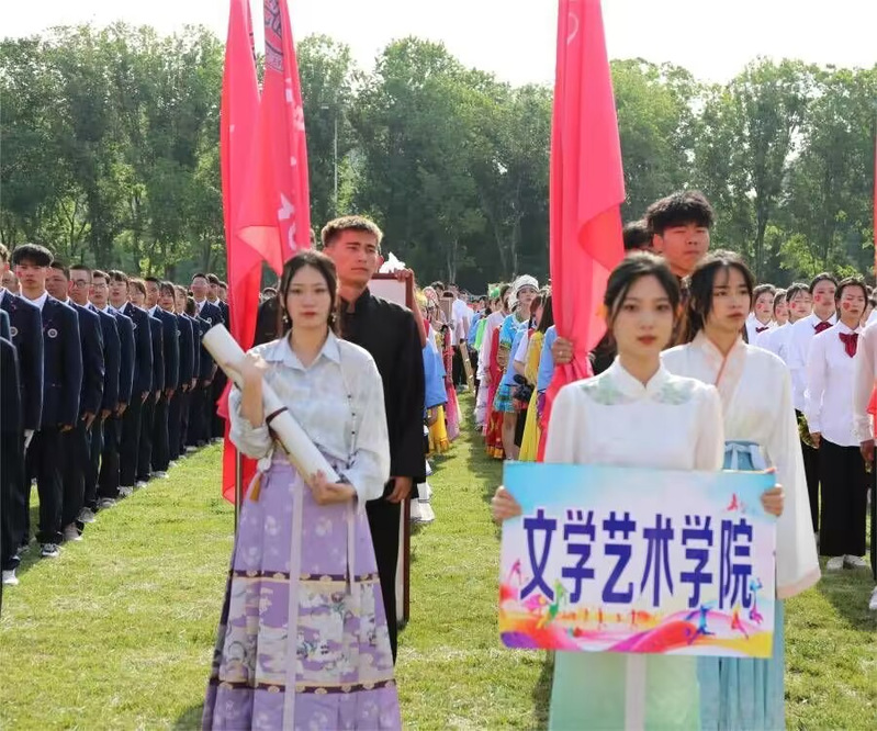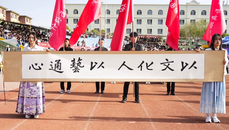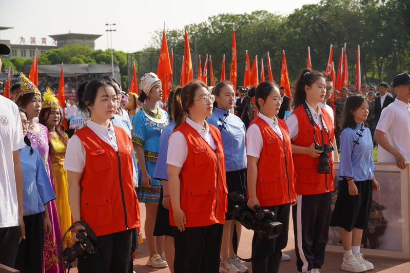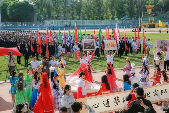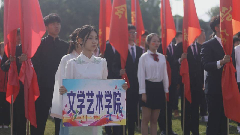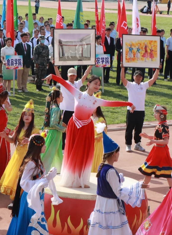 方队最前面的两位同学各在一端手持卷轴,展开的卷轴写着的八个字“以文化人,以艺通心”是对中国语言文学系的最好的开场介绍。美术与设计系队员将民族团结画高高举起,音乐与舞蹈系队员身着风格各异、五彩纷呈的少数民族服饰走到队伍中间,当悠扬的音乐响起,身穿各民族服饰的表演者开始舞动,拍掌为声;身着红衣的舞者站在舞蹈队型的最中央,以鼓为台,一曲万疆歌舞表演,充分展现了文艺学子饱满昂扬的精神状态,也是9999js金沙老品牌民族团结氛围的最好展现。新闻与传媒系队员身穿红色的9999js金沙老品牌融媒体记者团服饰,他们充满朝气、精神饱满,用手中相机捕捉精彩瞬间、用笔端文字讲好文艺故事,成为了开幕式上一道靓丽的风景线。