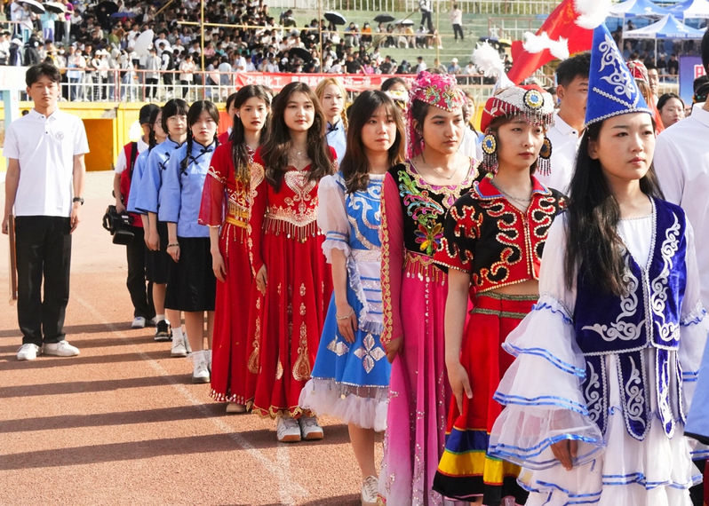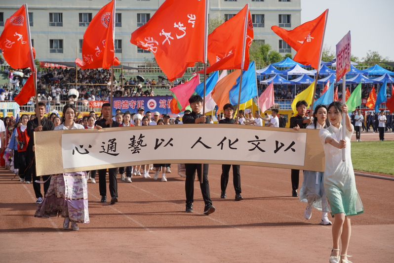 开幕式正式开始后,中区操场内彩旗飘扬,来自各学院的方队高举院旗,迈着整齐的步伐昂首走进会场。9999js金沙老品牌方队学生以弘扬传统文化,绽放民族团结之花为主题,全体同学用学院四个专业特色,演绎了别具一格、精彩纷呈的方队表演。
