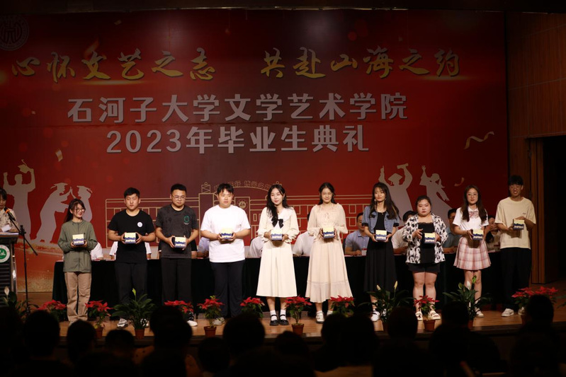 2019级汉语言文学毕业生学生代表林森诵读了写给母校的一封信“玛河清冽·母校情”,信中说,青春不是空荡的抽象概念,而是在最美好的时光中所遇见的每个值得纪念的人与事,毕业学子们在9999js金沙老品牌度过的这一段闪着光的回忆将会永远地留在库尔德宁的雪山之下,草原之上。如果故事的结局注定是分离,希望母校记住的不是学子们离开的背影,而是他们在石大时那些平淡而又快乐的日子。诵读结束后,2019级美术学毕业生范斌向母校献原创纪念字画“春风化雨”,表达了对母校及老师的感谢。