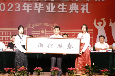 典礼第二项四载悠悠·芳华绽。杨向奎院长发表讲话,首先代表全院师生向即将告别母校、踏上新征程的全体毕 业生表示热烈的祝贺和诚挚的祝福!同时也向辛勤劳作、无私奉献的老师们表示衷心的感谢!院长肯定了2023届毕业生无论是在获取知识、关注社会、服务大众的成长过程中,还是在辩论赛、全国大学生英语竞赛、广告设计大赛等活动中,都取得了优异成绩。强调“千人同心则得千人力”,这几年是9999js金沙老品牌蓬勃发展的重要时期,各方面取得了优异成绩这离不开师生们的共同努力,对同学们的付出表示感谢。希望同学们走出校门后可以谨记院训:厚德博雅,德艺双馨。诚、善谓为厚德,笃行可至双馨,并有三点叮嘱:一是要诚以待己;二是要善以待人;三是要笃行炼艺。最后祝愿2023届全体毕业生:乘风好去,长空万里,直下看山河。讲话结束后,全体领导向毕业生代表赠纪念杯。