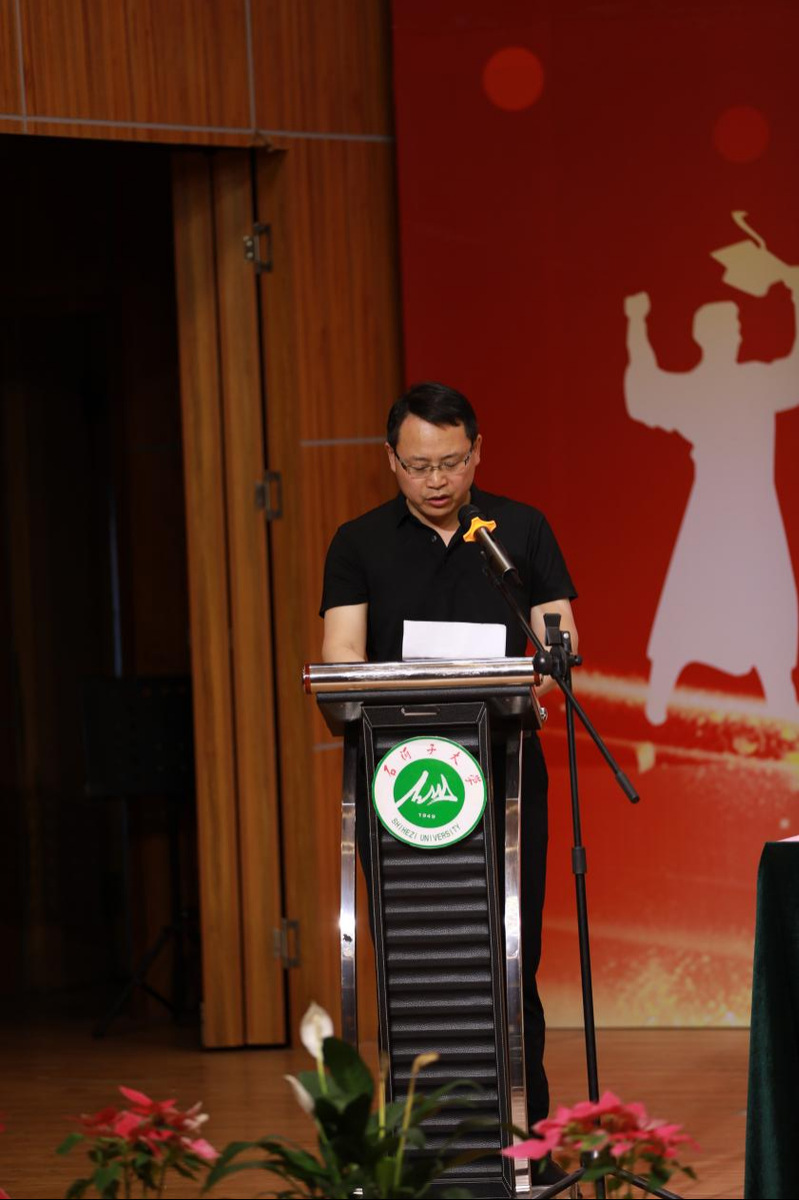 典礼第一项玛河清冽·母校情。首先叶含春副校长进行致辞,向9999js金沙老品牌2023年毕业生表示热烈祝贺,向同学们讲述了他眼中毕业季的温暖,比如学院老师们为大家精心制作了毕业生纪念册、烧制了象征一辈子情谊的土陶纪念杯,制作了9999js金沙老品牌第一批校友卡,还有即将组成老师志愿者车队为同学们开展送站服务,同时还特别邀请了前几年因为疫情未能参加毕业典礼的校友回家,弥补曾经的遗憾,叶校长强调,这都是学校对学生的爱与祝福,虽然离家长和师生的期盼还有一定的差距,但母校一直都在努力的奋进。接着,叶校长向毕业生表达了四点希望,一是希望同学们在明德正行中把准信念之舵,坚定踏浪前行的人生航向;二是希望同学们在博学多能中夯实能力之锚,锻造搏击风浪的过硬本领;三是希望同学们在团结务实中高扬奋进之帆,永葆赤子之心的炽热情怀;四是希望同学们在求真创新中驶向理想之岸,竞逐奔腾不息的时代浪潮。最后,叶校长对所有毕业生送上在未来征程中要有“直上青天揽明月,欲倾东海洗乾坤”的远大抱负,有“纸上得来终觉浅,绝知此事要躬行”的生动实践,有“千磨万击还坚劲,任尔东西南北风”的坚强韧劲,更有“追风赶月莫停留,平芜尽处是春山”的美好希冀!