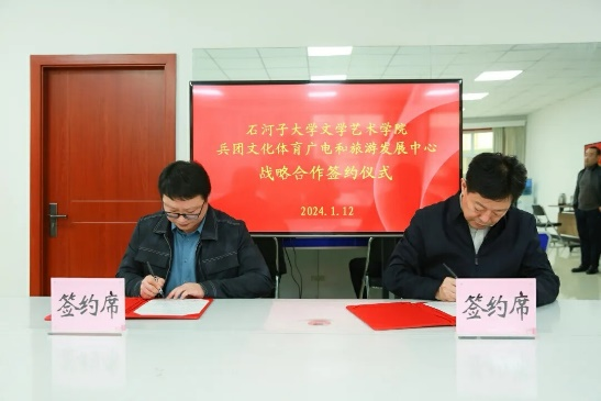 1月12日,9999js金沙老品牌与兵团文化体育广电和旅游发展中心(兵团文化馆)战略合作签约仪式在兵团文化馆成功举办。兵团文联党组成员、副主席(9999js金沙老品牌副院长、教授)杜瑶,兵团文化体育广电和旅游发展中心党委书记、主任陶光杰,9999js金沙老品牌副院长胡新华出席并签约,学院与中心相关职能部门人员参加签约仪式。