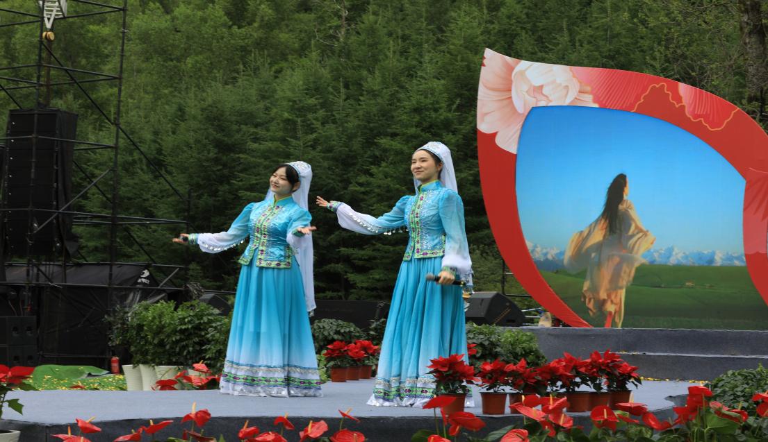 唐玉颜(左)、肖雨杭(右)在展演上演唱歌曲《花花尕妹》(新华社记者张智敏 摄)