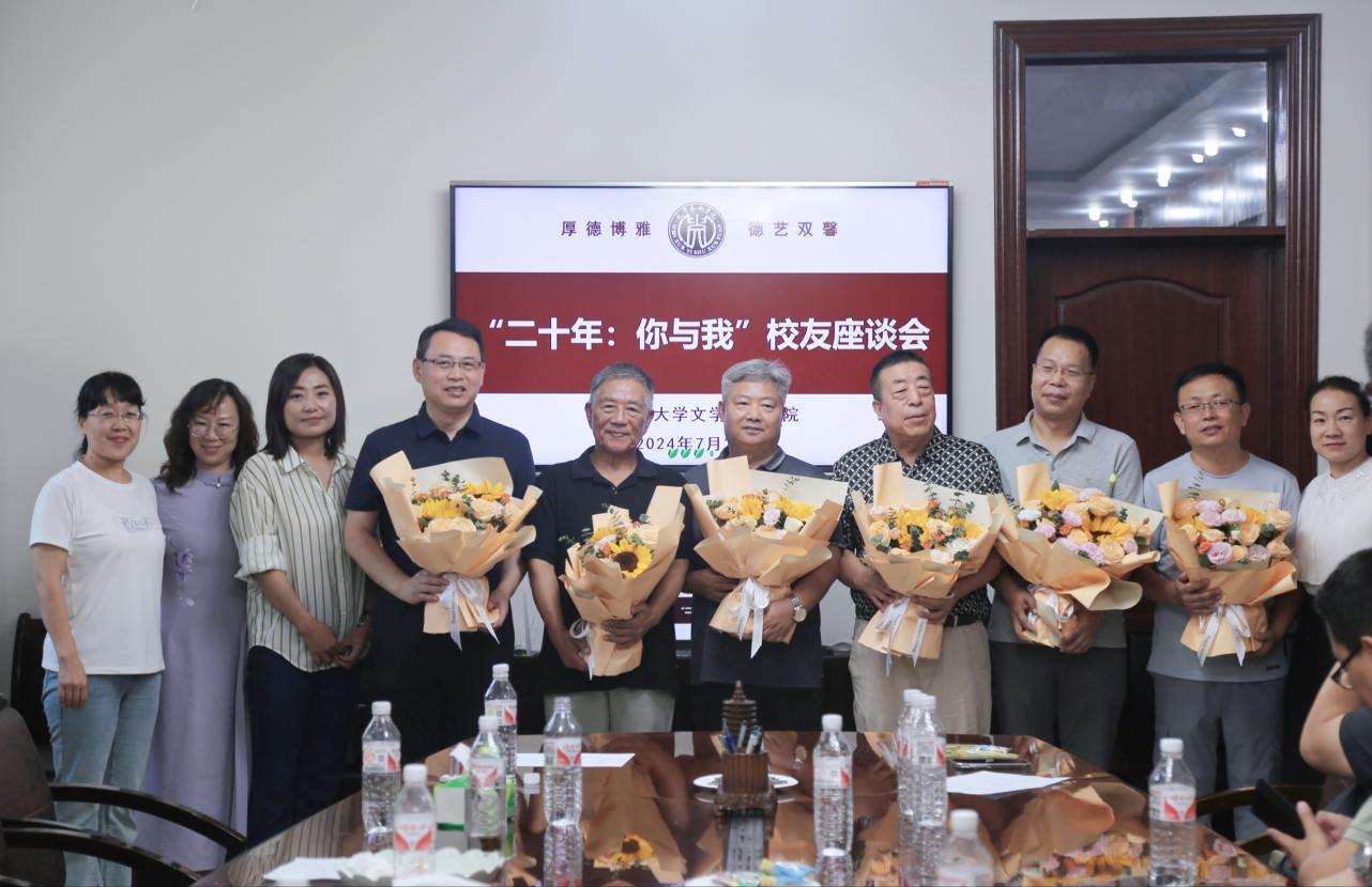 “二十年:你与我”校友座谈会上,学院党委副书记、院长杨向奎代表全体师生,向校友们表示了最热烈的欢迎,并介绍了学校、学院近年来在人才培养、学科建设、教学科研方面取得的成绩。与会教师对2000级学生仍秉持着“明德正行,博学多能”的石大校训感到骄傲,对校友们能够在各行各业发扬兵团精神、石大精神表示自豪,希望校友常回家看看,一如既往地关心关注学院的建设发展,为母院发展汇聚更多资源、贡献更大力量,并表达了对校友未来发展的美好祝愿。校友们回顾了在校求学时的趣闻轶事、点滴记忆,“今日那年:校友才艺展示、再上一堂课”,重温学位授予仪式,校友向中文系捐赠办公用品、向恩师赠送鲜花,中文系领导向校友赠送纪念品……师生同聚学院,共忆青春岁月,同谋专业使命与责任担当。