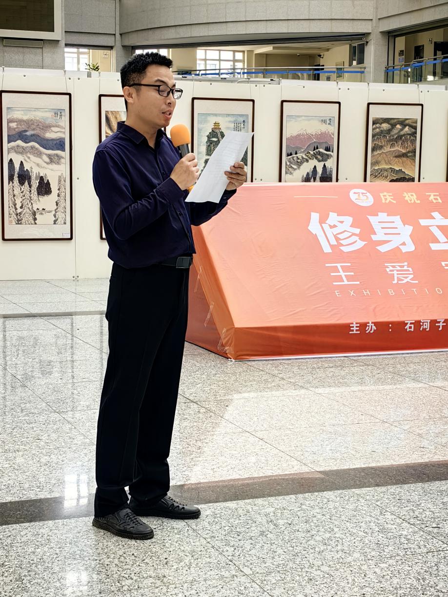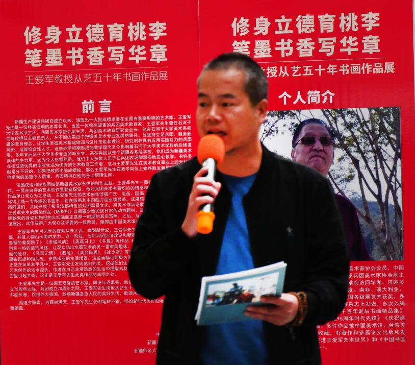 刘洪代表美术与设计系师生,对画展圆满开幕表示祝贺,并受原兵团文联副主席郭承云先生委托诵读其贺信。贺信中说,王爱军教授为人谦和,忠诚实在,踏实勤勉,致力于党的教育事业;他以良好的师风、学风影响了一批批师生,受到广泛赞誉;他专业素养高,艺术成就显著,创作了一批好的书法、版画、国画作品。
