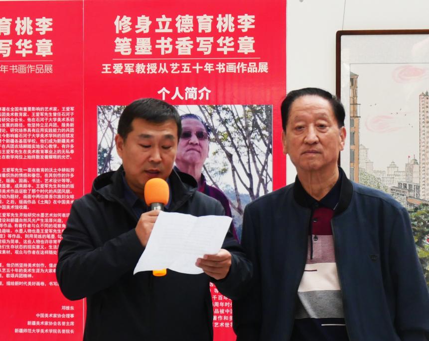 王爱军教授对前来观展的嘉宾和朋友表示热烈欢迎和感谢。他说:“今天展出的书画作品,是我一生对党、国家、人民、祖国山河、新疆兵团的认知和描绘,是我对生活美和自然美的深刻感悟,也是在繁忙的教学、行政管理之余以及退休之后呕心沥血的创作,是对50余年来美术创作和教育生涯的一个总结。如今,我已年近耄耋,有生之年我会不忘初心、牢记使命,继续发扬兵团精神和胡杨精神、老兵精神,继续用画笔歌颂党、歌颂人民、歌颂祖国,歌颂新疆兵团!继续为祖国山河绘画,奉献终身!”